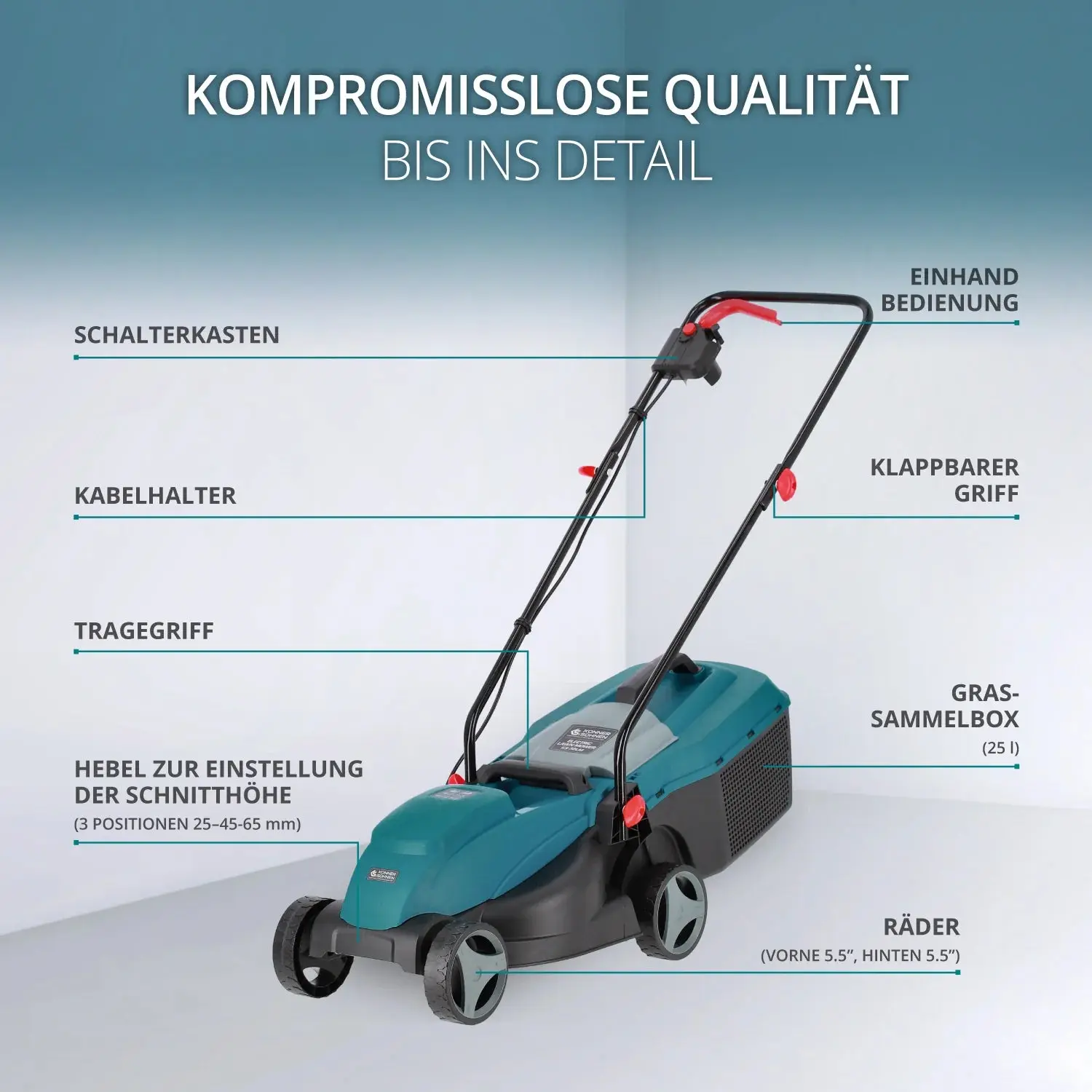 - Schnitthöhenverstellung: 3 Positionen (25–45–65 mm) für individuelle Rasenpflege.